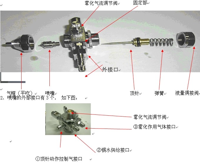 1、 噴咀将錫水霧化(huà)後噴射的裝置,由(yóu)噴芯、頂針、氣帽(平(píng)吹、圓吹)、彈簧、液量(liàng)調節閥、固定部、外(wai)接頭等構成。