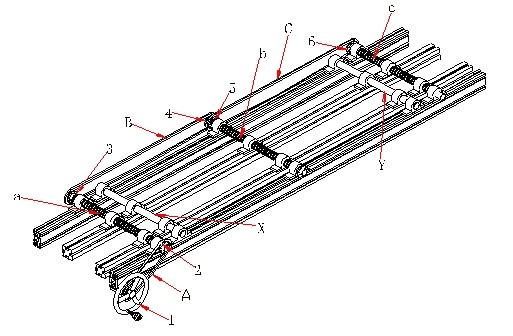 調(diao)整調幅手輪1、經鏈(lian)條A帶動從動輪2轉(zhuan)動,因從動輪👈2、3固定(dìng)在同一調節螺紋(wén)軸a上,從而從動輪(lún)3轉動,經鏈條B再🔞帶(dai)動從動輪4、5同時轉(zhuan)動,再經鏈條C帶動(dong)從動輪6轉動,因從(cong)動輪2、3、4、5、6大小一樣,故(gù)整個傳動過程是(shi)同步進行的,也就(jiu)是說,在整個調幅(fú)過程中,調節螺紋(wén)軸🔴a.b.c同步轉動,從而(ér)驅動可移動導軌(gui)在導向支撐軸X、Y上(shang)等距離移動,當然(rán),此時傘形齒輪同(tóng)時也在棱軸上滑(huá)動,從而🈲順利完✊成(chéng)調幅動作。