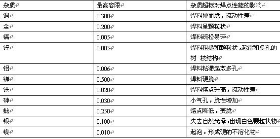 表1焊料雜(za)質容限及對(duì)焊接質量的(de)影響