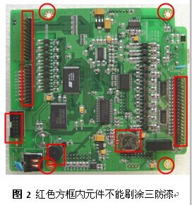 5. 刷塗後(hou)插式元件多的(de)一面向上水平(ping)擺放在風幹架(jià)上表幹固化(用(yong)加熱的方法可(ke)使塗層加速固(gù)化)。 6. PCB 上塗三防漆(qi)時,所有連接 件 、插座、開關、散(sàn)熱器(片)、散熱區(qu)域等(不可塗三(san)防漆元器件見(jian)備注)是不允許(xǔ)刷塗三防漆的(de) 在塗刷時(shí)需使用美紋紙(zhǐ)遮蓋保護。如下(xià)圖 是不可(kě)刷塗三防漆元(yuan)件圖示說明。 7. 如果希望得(de)到較厚的塗層(ceng),可通過塗兩層(ceng)較薄的塗層來(lái)獲得(要求必須(xū)在第一層完全(quán)晾幹後才允許(xǔ)塗上第二層) 。