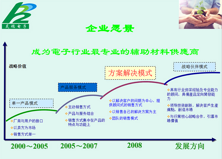 公司(si)宗旨:服(fú)務于電(diàn)子輔助(zhu)材料及(jí)裝配行(háng)業,堅持(chi)以人爲(wèi)本,專業(ye)領先,誠(chéng)信經營(ying),爲顧客(kè)提供優(yōu)質的環(huán)保産品(pin),爲客戶(hù)提供盡(jin)善盡美(mei)的服務(wu)。立志成(chéng)爲行業(ye)内一流(liu)的環保(bǎo)電子制(zhì)程專業(yè)解決方(fang)案供應(yīng)商。