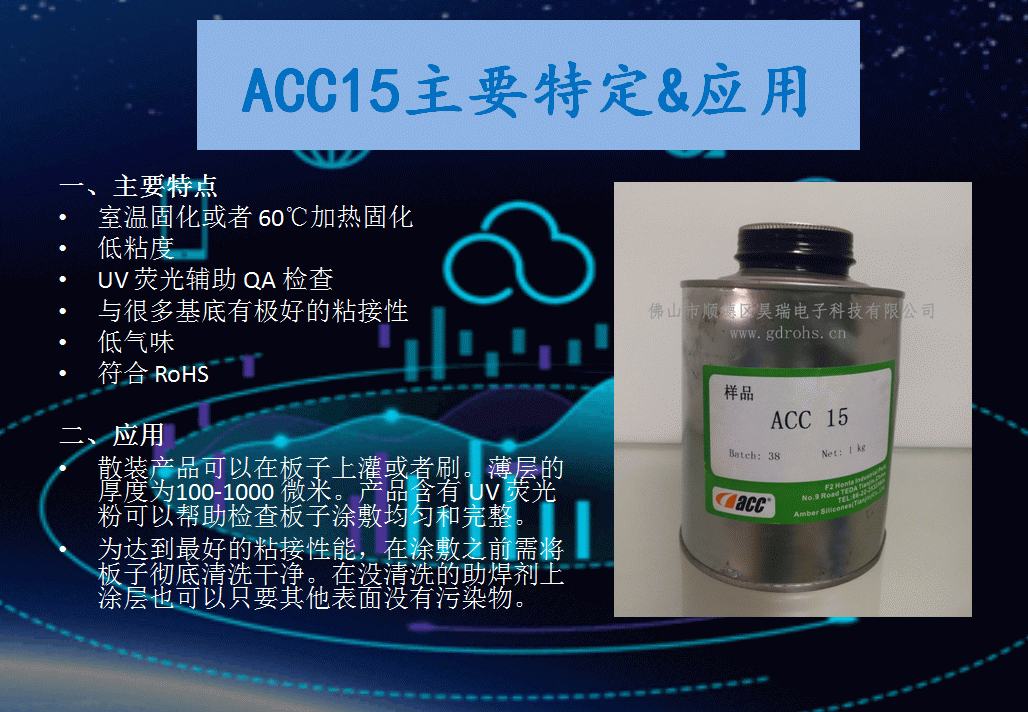 2、不含溶劑丙(bing)烯酸樹脂三防漆(qi)特點:UV固化,可在幾(ji)秒到十幾秒表幹(gan),顔色透明,質地較(jiào)硬,防化學腐蝕和(he)耐磨性也非常好(hao)。用紫外線來初始(shi)固化的三防漆,不(bu)需用溶劑。它們不(bú)燃燒,不含揮發性(xing)有機化合物,完全(quán)符合現行和拟議(yì)中的環保法規。它(ta)們可提供很好的(de)耐化學性能和耐(nai)熱性能,柔性好,表(biao)面光澤,粘附力強(qiáng),覆蓋好。固化時問(wen)短,是其他産品的(de)幾分之一(以秒計(ji)算.),通過提高生産(chan)率而大大降低了(le)産品的成本。